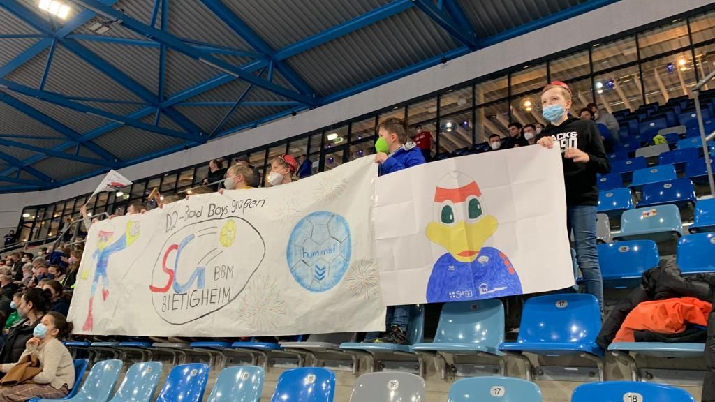 Eine große Delegation der Handballjugend machte sich am vergangenen Samstag auf, um ein Spiel der SG BBM Bietigheim gegen Empor Rostock in der Ege Trans Arena anzuschauen. Dank der großzügigen Spende der Abteilung, konnten alle 60 Teilnehmer*innen die Partie sogar umsonst verfolgen. Die D2-Jugend hatte sich im Vorfeld mächtig ins Zeug gelegt, um an der Verlosung des Zuschauerpreises teilzunehmen. Bereits zwei Stunden vor der Abfahrt trafen sich die Jungs mit Unterstützung von zwei Handballerinnen zur kreativen Gestaltung eines vier Meter langen Plakates. Zu gewinnen gab es ein Trikot der SG BBM Bietigheim, signiert von allen Spielern, und einem 100 € Gutschein. Kaum war der Wettbewerb in der Ege Trans Arena gestartet, präsentierten die Jungs und Mädels ihr toll gestaltetes Plakat und machten mit Tröten, Trommeln und Rätschen mächtig Lärm, um auf sich aufmerksam zu machen. Die Kids wurden für ihre Mühen belohnt und waren am Ende die glücklichen Gewinner! Alle Korntaler sahen ein spannendes Spiel gegen die Gäste aus Rostock, das die SG BBM Bietigheim in der letzten Spielminute noch für sich entscheiden konnte. Die kreativen Kids waren: Ben, Jannick, Philip, Melvin, Benni, Emil, Milan, Matti, Leni, Maja.